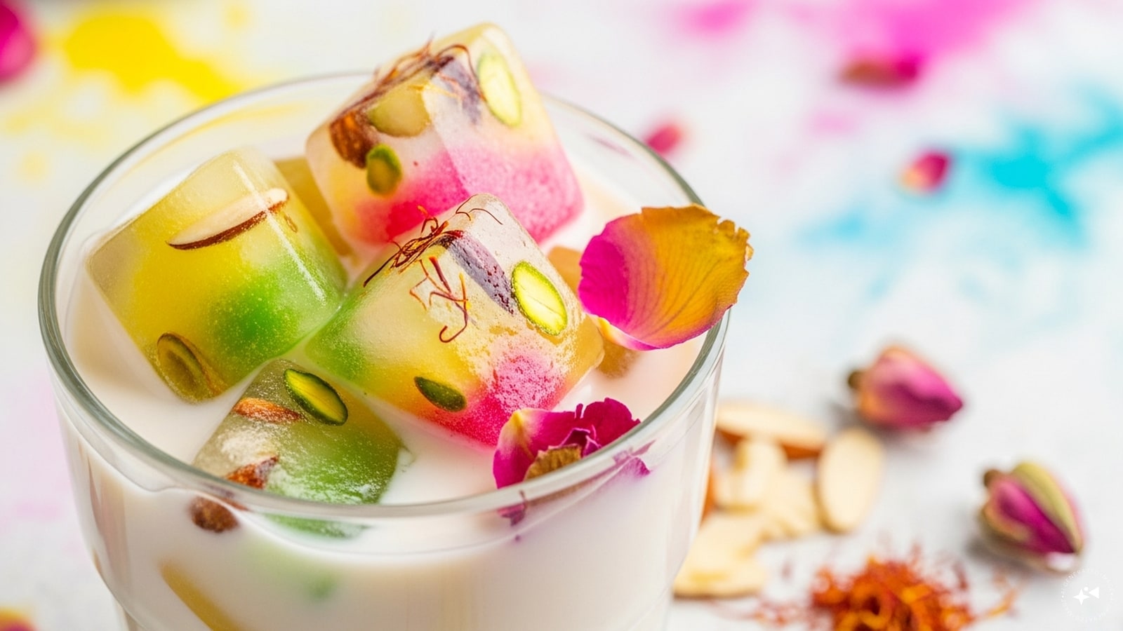 Pour leftover thandai into ice cube trays and freeze. Drop these flavorful cubes into milk, lassi, or even cocktails for a refreshing, colorful twist that keeps the Holi flavors alive for days