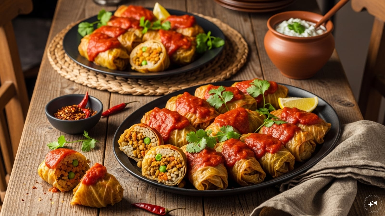 Spicy Soya Stuffed Cabbage Rolls: A vegetarian protein-rich alternative, soya granules cooked with masalas, peas, and onions create a delicious and filling stuffing. It is perfect for those looking for a meat-free but satisfying meal.